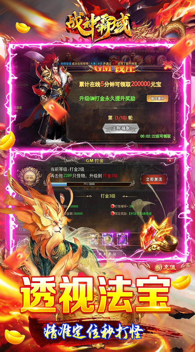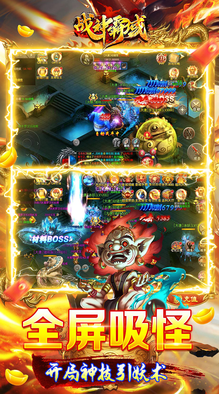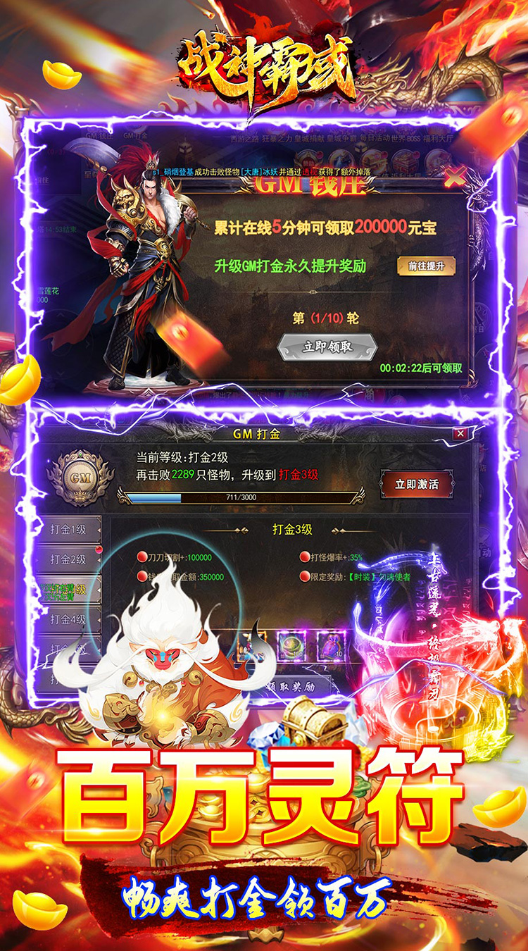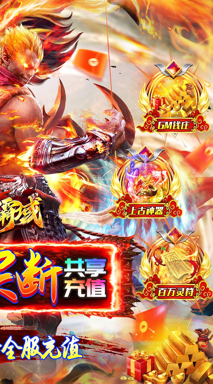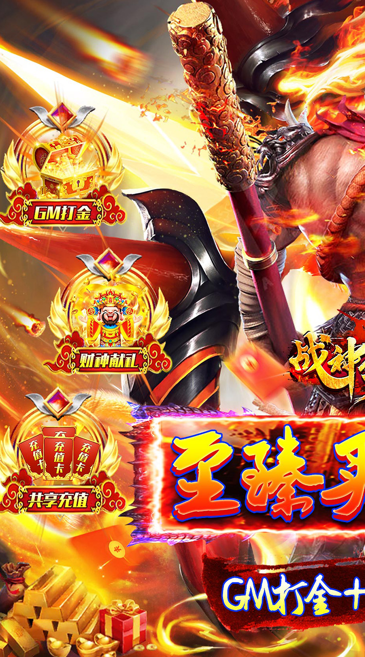 《战神霸域》真独家西游传奇,全新买断共享打金玩法,终极打金特权激活后可享受天帝宝库、神王赐福、财神献礼等多个活动福利,更有专属神位商店,升级神位等级可1灵符购买所有道具,每日登录送百万灵符+神位经验!新增共享充值玩法,全服的充值可共享,有大腿赶紧抱紧!专属独家GM打金玩法,打怪送称号+坐骑+羽翼时装,全新的猴王买断打金传奇!所有地图爆大量充值,无限打金!