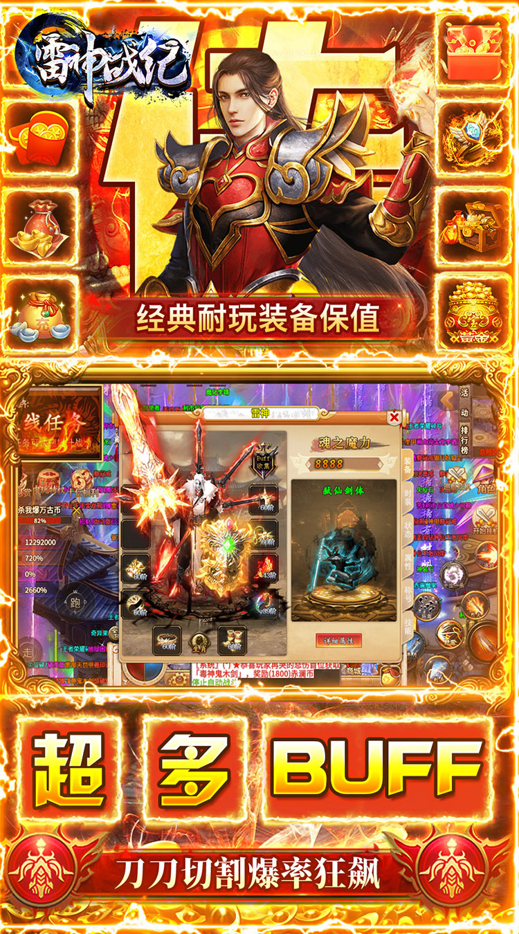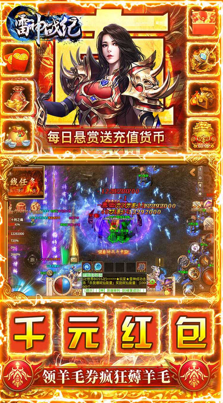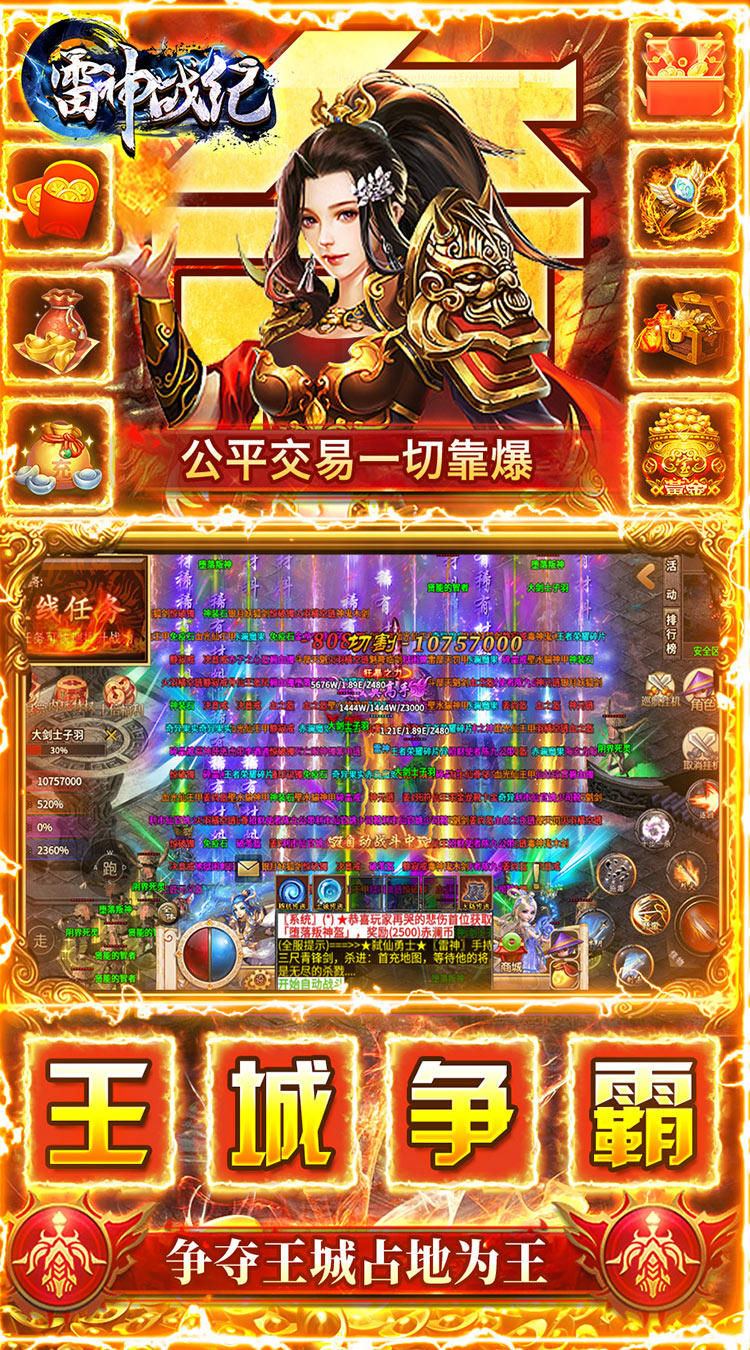 激情无限,热血复刻超变传奇!《雷神战纪》是一款满攻速打金高爆复古传奇手游。爆率全面提升福利强势升级,上线就送1000元红包和内玩特权,内置自动巡航系统让你解放双手爽快刷怪爆装。智能化战斗模式,独具特色的画面呈现效果,挥刀出残影装备全靠爆,此战共夺荣耀,沙城王者谁与争锋!