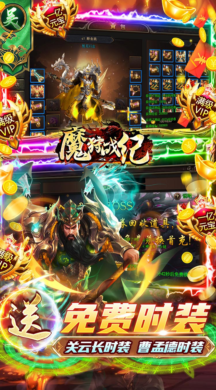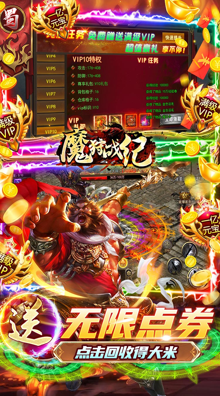 《魔狩战纪》全新大米代充,打怪获得代充券,使用可获得大米,真正的散人福利版本,还有全新特色魂环系统,魂环加成称霸三国!登录送代充魂环,完成任务送满级VIP,送无限点券,点券可兑换首充、自动回收、自动分解,超爽百倍爆率,万物皆可爆,满屏光柱,爆啥都是米!精英必爆点券!BOSS必掉大米!充值全靠爆!,一秒5刀,刀刀切割,砍怪如切菜,主线送关云长时装,三国传奇乱世等你来战!