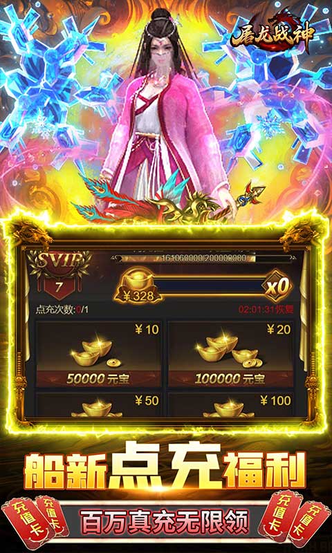 2、上线送vip15,元宝*1000000,金币*10000万、绝版时装套,豪华资源轻松开局!